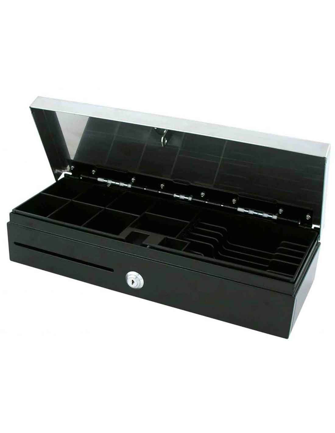 This flip top cash drawer has features like RJ-11 (6pins, solenoid 2&4) connection port, 3 position key lock, black color, 4.3 KG weight, 46 x 17 x 10 cm dimensions, 1,000,000 operations MTBF durability, etc.